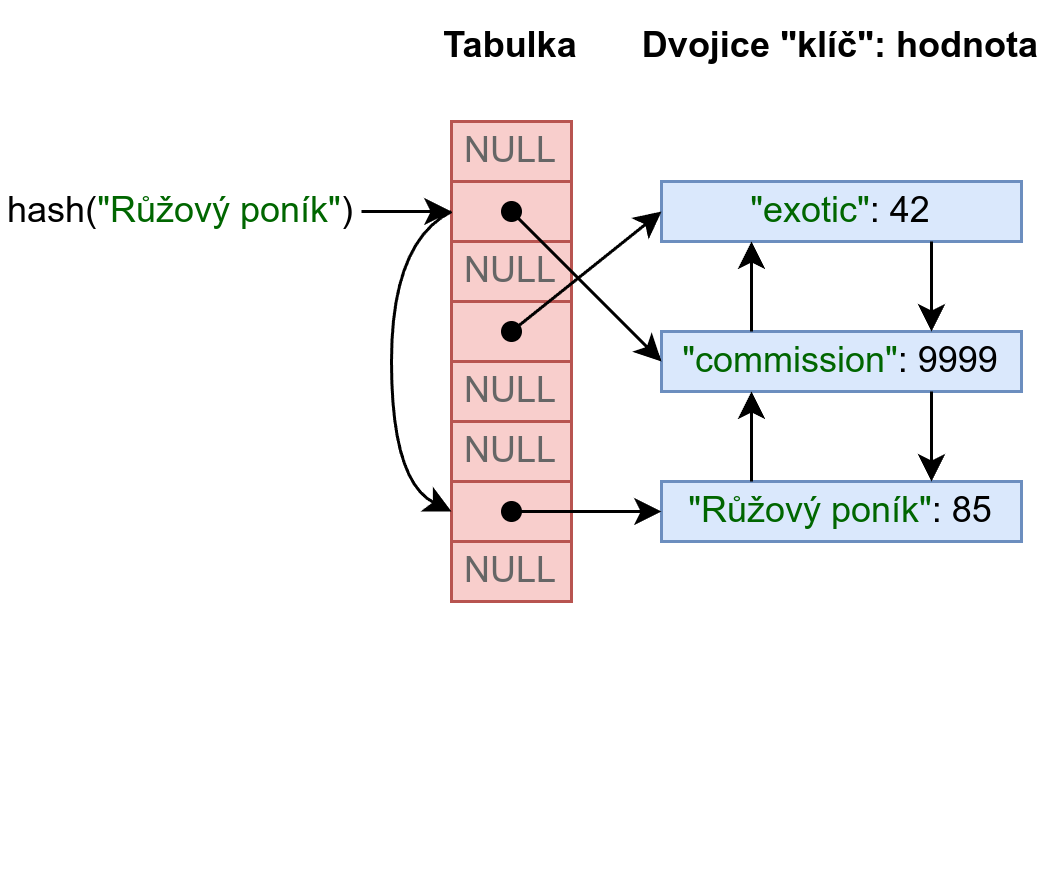 Hašovací tabulka je vyhledávací datová struktura, která asociuje hašovací klíče s odpovídajícími hodnotami. Klíče v našem případě jsou řetězce (posloupnost charakterů proměnlivé délky) a jak již název napovídá, klíče jsou za účelem indexace převáděny na haše – číselné hodnoty fixní délky. Na hašovací funkci nejsou kladeny stejné nároky jako v případě kryptografie, kdy dva podobné klíče musí mít výrazně odlišný haš, ale spíše na její rychlost. Index hledané položky lze jednoduše získat jako zbytek po dělení haše a velikostí tabulky. V případě že dojde ke kolizi, tzn. dva různé klíče mají stejný haš nebo dva různé haše jsou mapovány na stejný index, je postupně otestován dle deterministického algoritmu další index až se nalezne hledaný záznam se stejným klíčem nebo volné místo v tabulce. Nejjednodušší možnost je postupně zkoušet indexy +1, +2, +3, ... dokud nenastane jedna ze zmíněných situací, nicméně tento přístup má několik nevýhod (Vizte https://hg.python.org/cpython/file/52f68c95e025/Objects/dictobject.c#l33). V naší implementaci je využita pseudonáhodná řada popsaná následujícím algoritmem, kde hash odpovídá haši hledaného klíče a size velikosti tabulky: