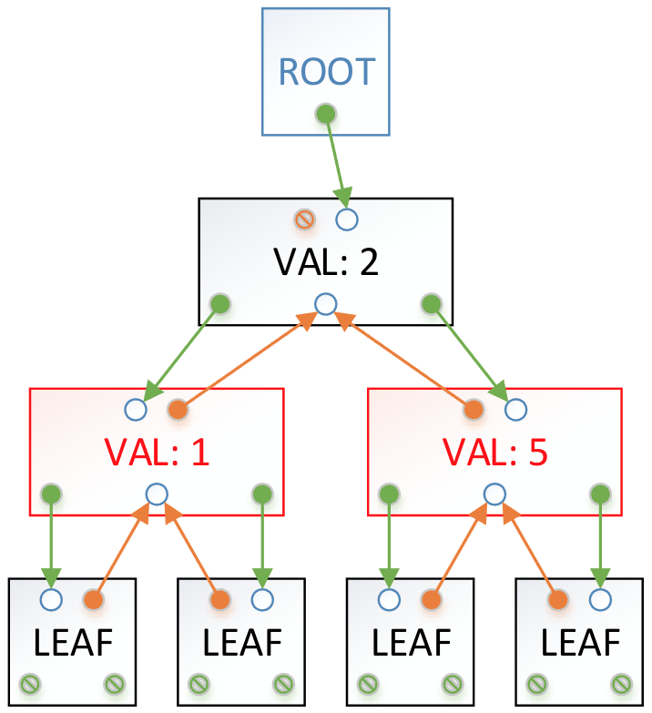 Red-Black Tree je stromová struktura (binární strom), která umožňuje provedení základních operací (vkládání, mazání a vyhledávání) v logaritmickém čase \(\mathcal{O}(\log{}n)\). Struktura stromu je tvořena kolekcí uzlů, které jsou propojeny tak, že každý má maximálně dva potomky (levý a pravý). Každý uzel pak tvoří další podstrom (který může být prázdný). Každý strom má pak právě jeden uzel, který nemá žádného rodiče a nazývá se „kořen/root” (v obrázku níže má hodnotu 2).